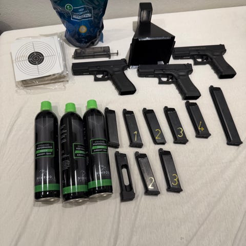 Rigtig fin glock 17 co2, med tilhørende co2 petroner, olie co2 petroner (vedligehold) kugler og 2 holster