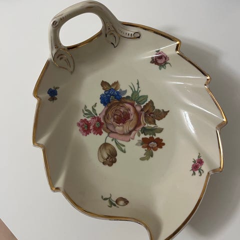 Fad med blomsterdekoration i midten og guldkant. Tallerkenen har en rund form med to håndtag på siderne. Materialet er porcelæn. Farverne inkluderer hvid baggrund med flerfarvede blomster og guldkant. Egnet til servering af mad.