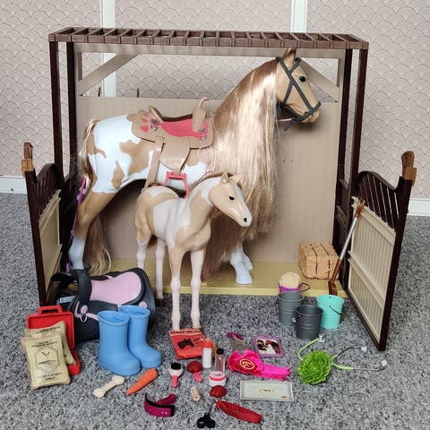 Stald, hest, føl og tilbehør. Der er små brugsspor men alt fungerer. Stalden måler ca. 50x60x35 cm.