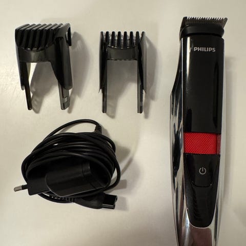 Philips Series 5000 hårtrimmer i sort farve. Inkluderer trimmer med justerbar kam og opladerkabel. Designet til præcis trimning af hår og skæg.