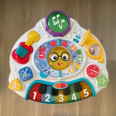 Det musikalske aktivitetscenter bringer musik ind i legen og tilskynder til selvudfoldelse. Musical Mix 'N Roll 4-i-1 gå vogn med aktiviteter fra Baby Einstein vokser med dit barn fra siddende til stående, til at danse og udforske! Hver af de 4 tilstande vil fange dit barn på dets aktuelle stadie i livet. Når det bruges som et gulvlegetøj, indgår det aftagelige keyboard i den spirende musikers åbningsnummer. Gå-tilstand lader barnet øve sig på at stå og gå. Dit barn kan skubbe musikken og lyset med sig for at give en mobil optræden! Skab et DJ-bord og eksperimenter med tempo og lyd for at skabe unikke baby-beats. Dette multifunktionelle legetøj fungerer endda som et bord til små børn til enhver aktivitet, som dit kreative barn kan drømme om.
