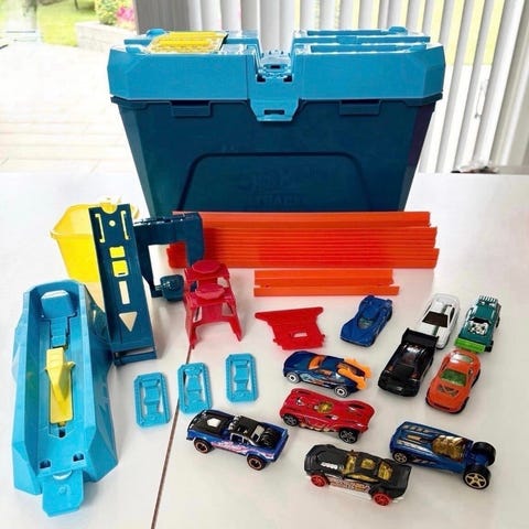 Hot Wheels bane-skinner med en masse tilbehør bl.a. en launcher. Der er 12 gule bane-skinner og 19 orange bane-skinner samt 30 blå vedhæftninger. 30 biler i forskellige farver. Der er altid blevet passet godt på det, derfor fremstår det som nyt. Fra røgfrit og dyrefrit hjem.