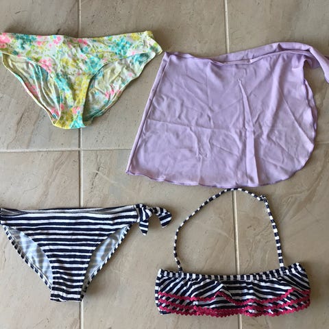 Badetøj børnetøj til pige i størrelse 110. Sættet består af en lilla overdel med mønster og matchende lilla underdel. Materialet er polyester med UV-beskyttelse (UV Tech).