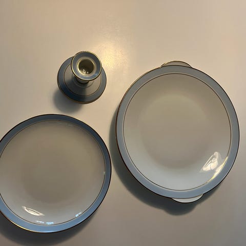 Stellet er elfenbensfarvet og dekoreret med lyseblå kant som er 1 cm bred og mat guldkant.