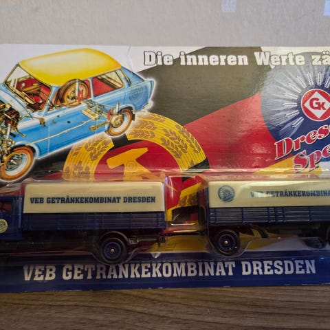 Modellastbil med trailer, der reklamerer for Kümmerling, en tysk urtelikør.