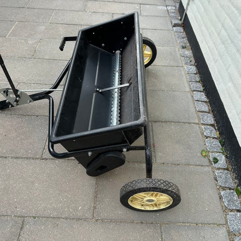 AI tekst: Sort luftudligner udstyret med stjerneruller og hjul for nem transport. Designet til at forbedre jordluftning ved at skabe små huller i jorden, hvilket kan hjælpe med at forbedre vand- og iltgennemstrømning. Passer til brug i haver og landbrug.