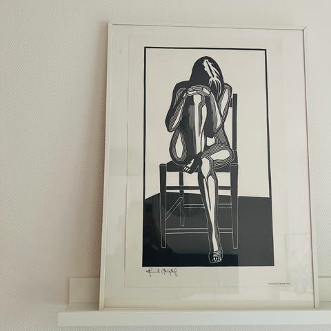 To indrammede billeder med sort ramme, hver indeholdende abstrakt kunst. Det ene billede har en rød baggrund med en sort og hvid figur, mens det andet har en blå baggrund med en hvid og sort figur. Billederne kan anvendes som vægdekoration.