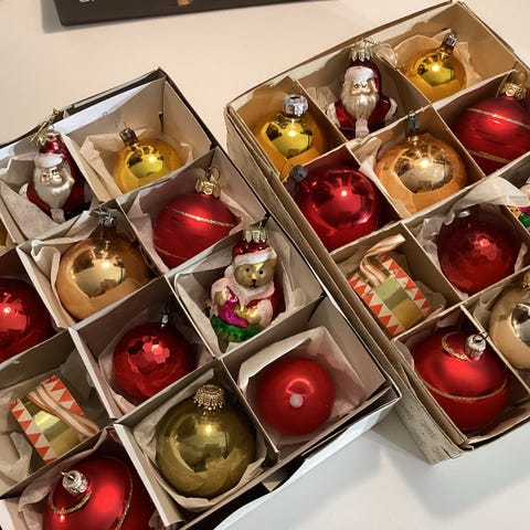 Gamle vintage og retro julekugler, forskellig størrelse materiale og alder, men disse 2 sæt er primært udført i glas. Der kan være aldersrelaterede brugsspor på enkelte af delene og æskerne følger ikke med. Der er en gammel fin guldjulemand på månen, glaskugler med guldglimmermotiv fra 80’erne, Antikke kugler med smal hals, de allersmukkeste spiraler og de fineste perlekugler.