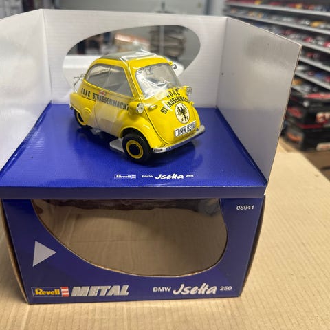 Revell Isetta 200 modelbil i gul metal. Detaljeret miniaturemodel af den klassiske Isetta 200 bil med tydelige kendetegn og realistiske proportioner. Velegnet til samlere og modelbilentusiaster.