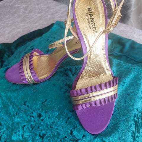 Velholdte og næsten som nye fest sandaler i skinnende bordeaux med stor simili sten. Tynd hæl på 5 cm.