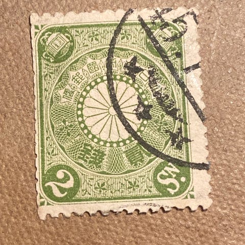 Japan 3 Sen frimærke i rød farve med traditionelt japansk design, inklusive sol og bjergmotiver.