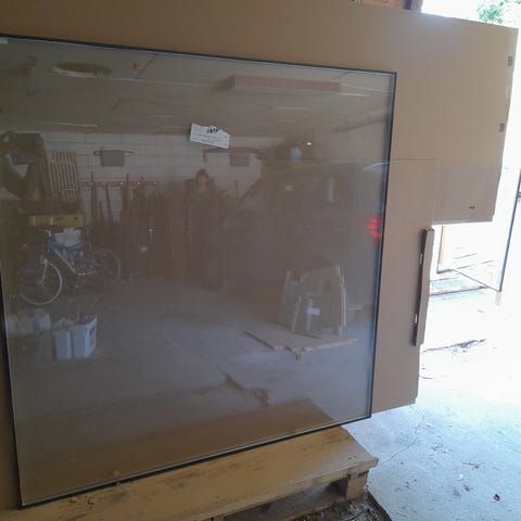 Ubrugt energi-rude med hvid ramme, som aldrig har været monteret. 56,6 bred og 172,6cm høj. Rammen har en mindre skade på den indvendige side af rammen, som let kan spartles og males.