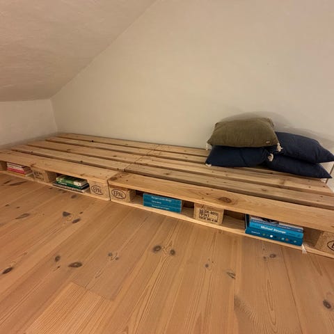 Fed pallesofa, bygget på 4 EUROPA-paller med hjul så man nemt kan flytte rundt på sofaen.