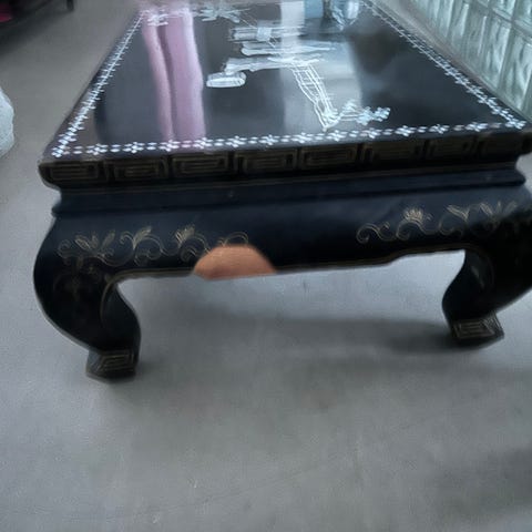 Elegant hånddekoreret sofabord i kinesisk stil, i rigtig god stand. Bordet har flotte detaljer, tre runde motivplader på toppen samt udskårne og dekorerede ben. Det er et solidt og dekorativt møbel, som giver rummet et unikt udtryk.