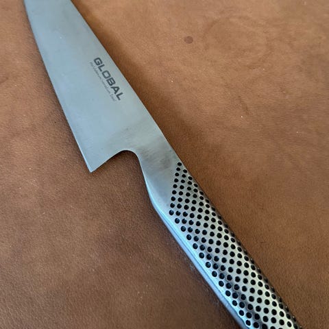 Global Rosendahl køkkenkniv fremstillet i rustfrit stål. Kniven har et ergonomisk design med et mønstret håndtag for bedre greb. Velegnet til forskellige køkkenopgaver som skæring og hakning af madvarer.