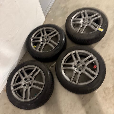 Fine alufælge med 2 Continental vinterdæk med 75 %mønster, samt 2 stk Goodyear med 95 % mønster.