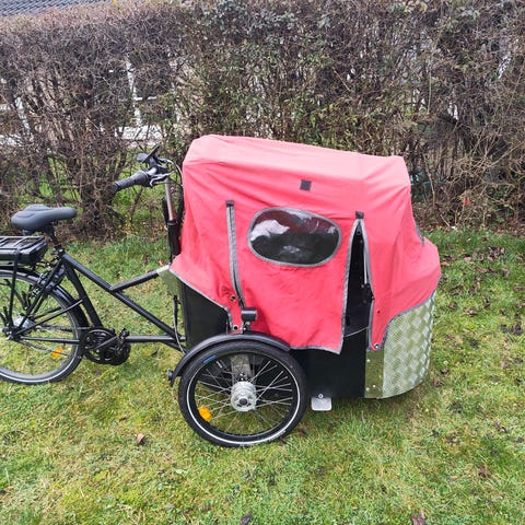 En flot cykel, med gennemsigtig front. Kalechen er dog slidt i kanten, se foto. Nykøbte lapper til reparation følger med.