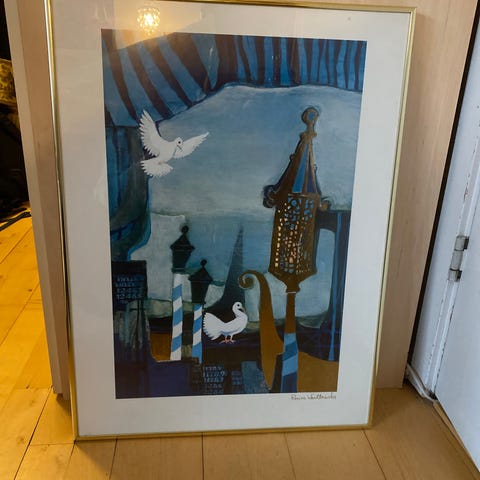 Billedet viser en kirke med detaljer i lilla, sort, hvid og orange farver samt duer i forgrunden. Trykket har en kombination af geometriske former og teksturer, der er karakteristiske for kunstnerens stil.