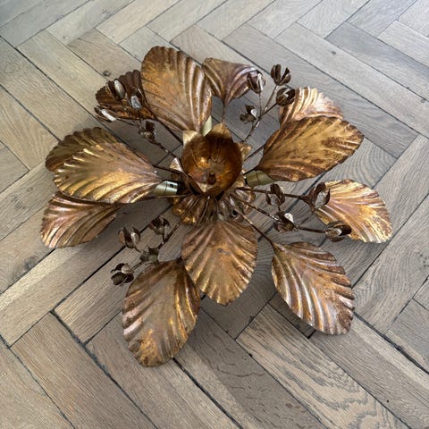 NETOP NEDSAT PRIS: Smuk dekorativ loftlampe lavet af Hans Kögl, smukt udformet som et samlet neg, med kornakser, i Regency stil. Lampen er fra 1960 erne, i forgyldt metal og har 3 lyspiber til el.