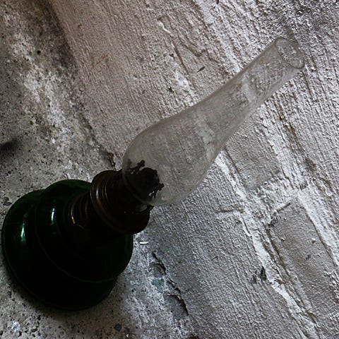 Petroleumslampe uden mærke med to medfølgende glas. Lampen er lavet af metal med en glasindsats og har en klassisk design. Velegnet til oplysning i hjemmet eller ved udendørs aktiviteter.