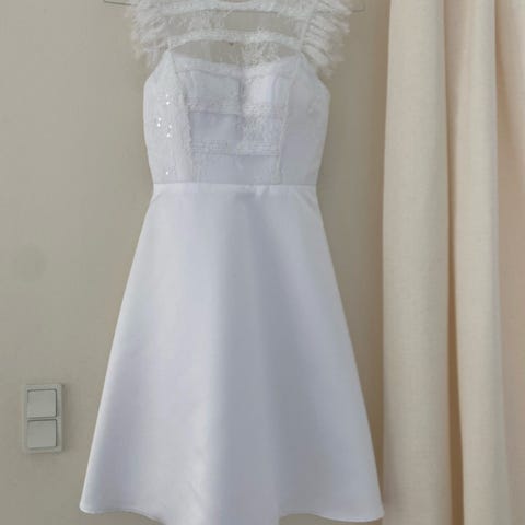Konfirmationskjole, Petites, str. S, Str XS/S. En ret sjælden udgave af en konfirmations kjole med nedringet rygstykke. Kun brugt en enkelt gang. Fin stand. Kan også bruges som brudepigekjole, festkjole eller sommerkjole.