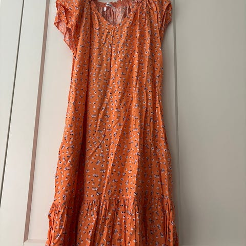 Kjole fra Co`couture i neutral råhvid med grafisk print af pink/blå muslingeskaller. Kjolen har v-udskæring som kan lukkes og åbnes yderligere med trykknapper samt 2 sidelommer. 2/4 ærmer med pufeffekt Kjolen er syet 100 % bomuld i a-facon i 3 etager og rynkeeffekt. Længde målt fra skulder 130 cm. Nyvasket i super fin stand.