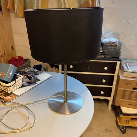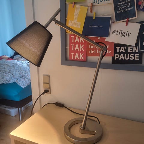 Fed skrivebordslampe i metalgrå fra Ikea. Fuld funktionel med en stor skærm. Den lækre, fede detalje i den bruserslange bøjelige arm/stang (?🤔) gør, at lampen en kan drejes i alle retninger, super praktisk.