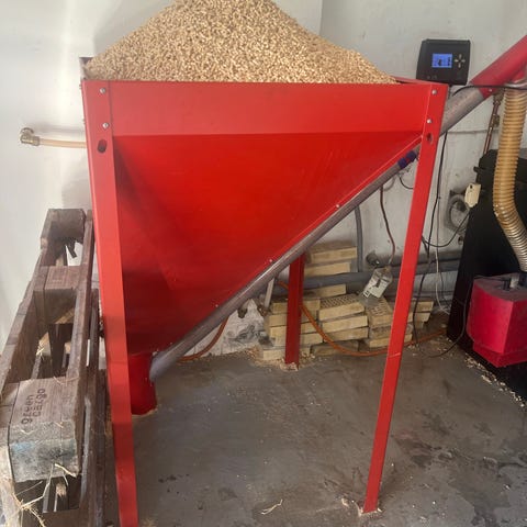Træpille beholder. Der har kun været træpiller i den 1 gang.