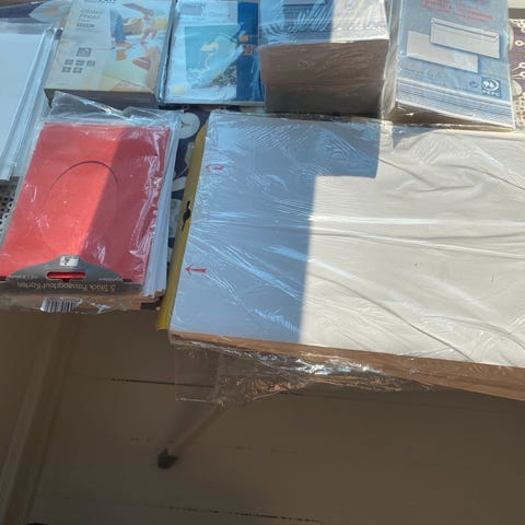 ligefra tilbudsmapper, ringbind, masser faneblade af forskellig art, plastlommer, kuglepenne, postits, notesbøger, ordbøger, hæftemaskine, lommeregnere mm.