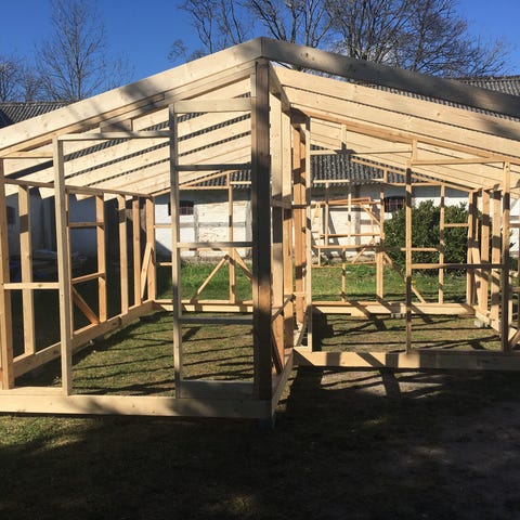 40 m2 træhuskonstruktion, Restsalg, usamlet opdelt i rammer og løsdele for transport på trailer.