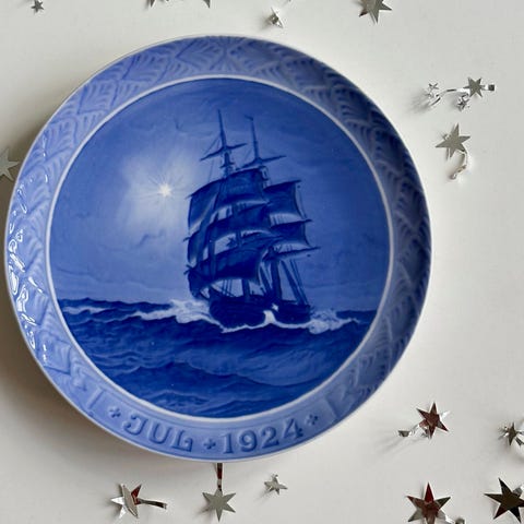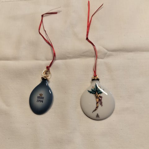 Royal Copenhagen Juleplatte julepynt fra 2023 i blå porcelæn. To forskellige designs med rød snor til ophæng. Velegnet til juledekoration.