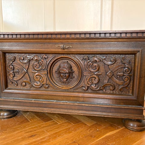 Ualmindelig flot, stor og velholdt Antik trækiste med buet låg og malet dekorativt mønster i grøn og rød farve. Kisten har metalhåndtag på siderne og kan løftes af soklen.