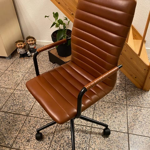 Sorte kontorstole i kunstlæder og stel i sort metal. Stolen kan justeres i højden. Nypris 999 kr pr. stk.
