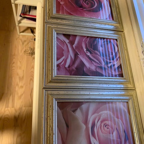 To billeder med rosemotiv, hver i træramme. Det største billede har en detaljeret tegning af en rose med geometriske elementer, mens det mindre billede viser en mere simpel rose. Begge billeder har en neutral farvepalet og passer til dekorative formål.