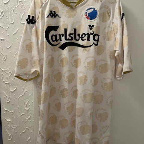 Kappa F.C. København fodboldtrøje i størrelse M til mænd. Trøjen er blå og har flere trykte logoer, herunder Carlsberg, Champions League, og F.C. København emblemer. Materialet er egnet til sport, især fodbold.sælger denne trøje nr 2 POSPECH med autograf