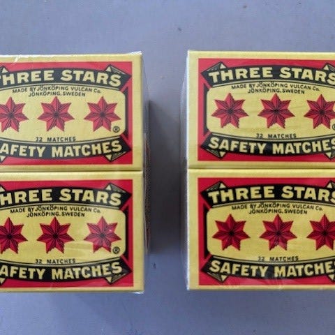 Sælger 2 pakker Tordenskjold husholdningstændstikker, hver pakke indeholder 3 små æsker à ca. 100 tændstikker / 7 cm → i alt 6 små æsker / ca. 600 tændstikker.