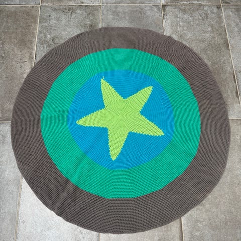 IKEA Børn Quiltet Tæppe med patchwork mønster i rød, blå og hvid farve. Tæppet har forskellige mønstre, herunder stjerner og tern, og er velegnet til børneværelset. Materialet er blødt og quiltet for ekstra komfort.mål 140x200cm