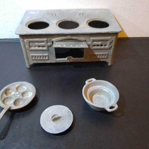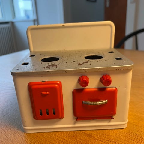 Legetøjs komfur fra start 60’erne i metal med rød og hvid farve, inklusive en kedel, en pande og to gryder. Komfuret har to knapper og en ovnlåge. Sættet er velegnet til leg og rollelege for børn. Kaffekandens hank er røget af men medfølger