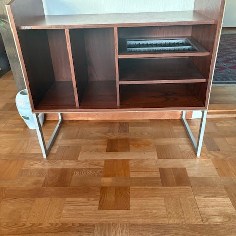 Sort Bang & Olufsen stereobænk MC30 med metalstel, designet af Jacob Jensen i 1970'erne. Minimalistisk og tidløst design. 3 udtrækshylder og rum til plader. Har et hak i toppladen men ellers ok vintage stand. Eftermonteret med solide hjul. Højde målt med stel. Højde uden stel 39.