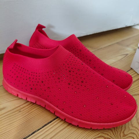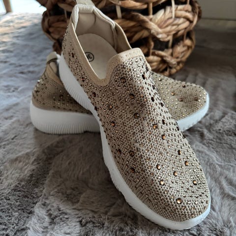 Fine sneakers med sten i sandfarvet og sølv snørebånd og lynlås i siden. Aldrig brugt.