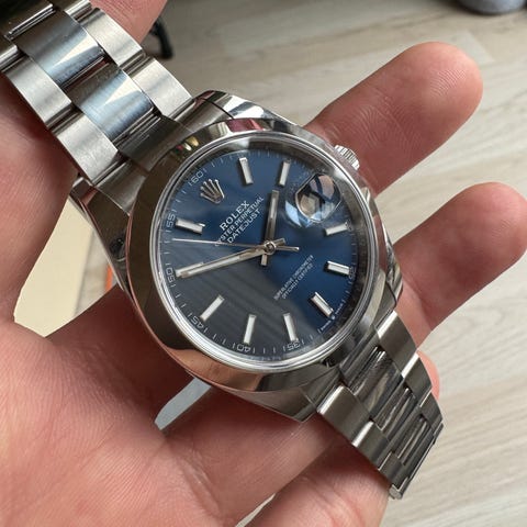 Uret er købt nyt af mig hos Ragnar i Odense i sep. 2018 og er kun båret af mig og kun nogle få gange. Uret er med blå skive og jubilee lænke. Uret kommer som et komplet sæt med boks, certifikat osv. Stand 9,5/10 - der er kun de ungålige hairlines.