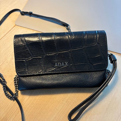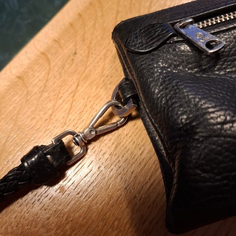 En kompakt og elegant clutch med flettet håndledsrem. Tasken har en lomme på forsiden og lukkes sikkert med en lynlås i toppen. Indvendigt er der 3 hovedrum - et med lynlås, et med lille lynlåslomme og et stort. Der plads til seks kort.