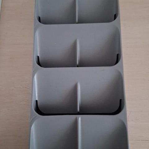 Joseph Joseph DrawerStore Bestik Organizer i grå farve, lavet af plastik. Måler 5,7 cm i højden, 11 cm i bredden og 39,5 cm i længden. Designet til at organisere køkkenbestik og små redskaber i skuffer. Ikke egnet til opvaskemaskine.