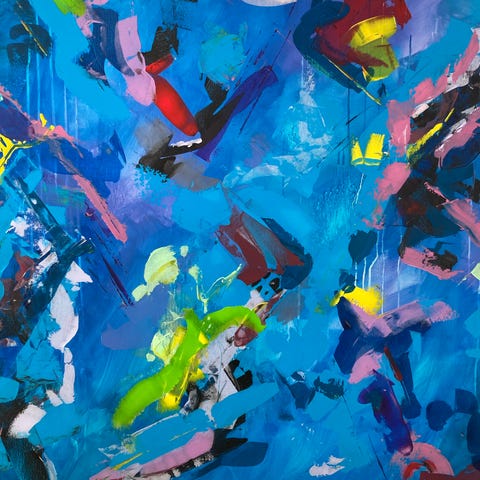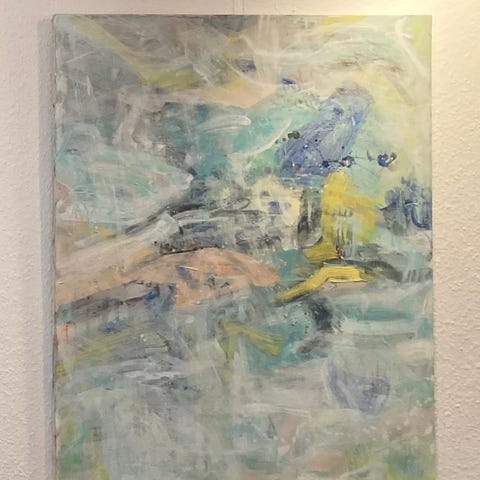 Maleri i abstrakt stil med dominerende grønne og gule farver. Udført i akryl på lærred. Velegnet til vægophæng i boliger eller kontorer for at tilføje farve og kunstnerisk udtryk.