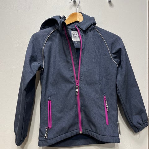Play Tech børnejakke i grå farve, størrelse 128, designet til piger. Jakken har lynlåslommer med pink detaljer og hætte. Materialet er blødt og funktionelt, egnet til udendørs brug.