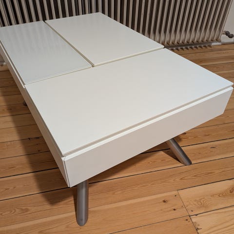 Smart og robust sofabord. I god kvalitet. Meget pæn og velholdt. Der er en plade under bordpladen, hvor man kan opbevare ting under bordet. Målene Længde 140, bredde 62 og højde 48 cm.