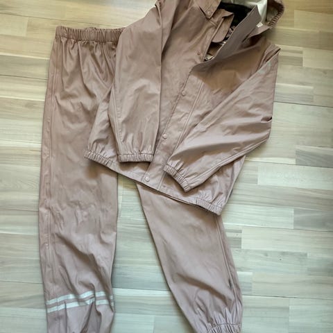 mikk-line børne regntøj i størrelse 104, grøn farve, unisex. Sættet består af jakke med hætte og bukser med seler, designet til at beskytte mod regn og fugt.