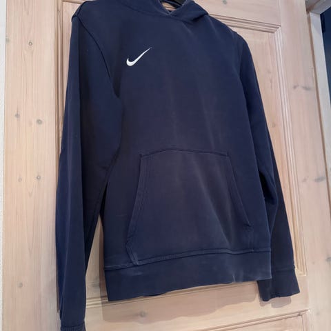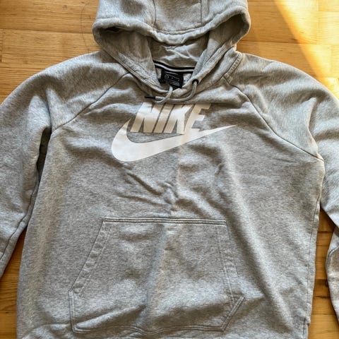Nike Sportswear hoodie i størrelse XL, lille i størrelsen, unisex. Hættetrøjen er grå og fremstillet i et materiale, der typisk bruges til sportstøj. Modellen har en hætte og en frontlomme.