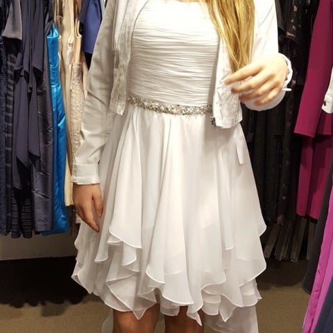 Konfirmationskjole, Luxux, str. 38, Fin og enkel ærmeløs kjole med korsagelukning, som gør at den nemt kan tilpasses konfirmandens figur, og der er således ikke ændret på originalen. Brugt én gang, vasket på skåneprogram, så fremstår ny og ren. Den korte lyseblå jeansjakke kan tilkøbes.