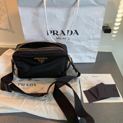 Prada taske i sort farve fremstillet af andre materialer. Tasken inkluderer en justerbar skulderrem og en kort kædehåndtag. Der medfølger en lille separat pung i samme materiale og farve. Designet til kvinder.